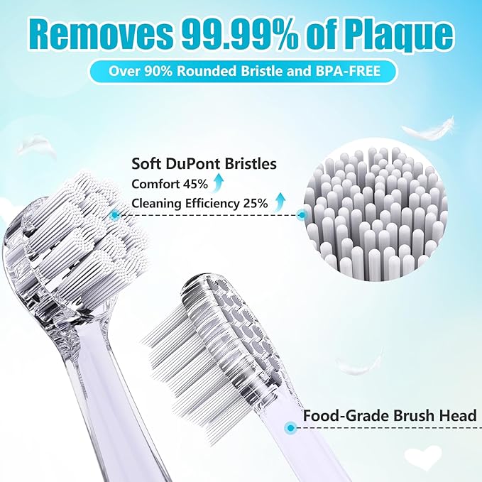 - Toddler Electric Toothbrush Specifically for Kids Aged 0-3: Babies start to sprout their first tooth around six months. This baby electric toothbrush features a soft LED light to help locate food residue and plaque. It is equipped with a 16,000 VPM motor (A+) and bristles with a roundness rate of over 90% (A+), protecting their mouths from cuts. It effectively prevents plaque and cavities caused by milk, with a cleaning efficiency 3.5 times higher than manual toddler toothbrushes.