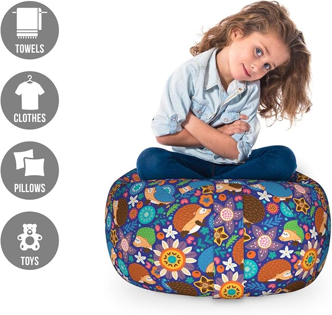 Lunarable Animal Storage Toy Bag Chair, Cartoon Hedgehogs Living in Fantasy Forest Pattern with Flowers Branches Leaves, Stuffed Animal Organizer Washable Bag, Small Size, Blue Orange
