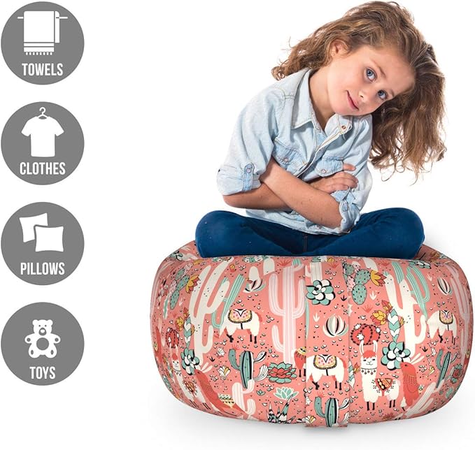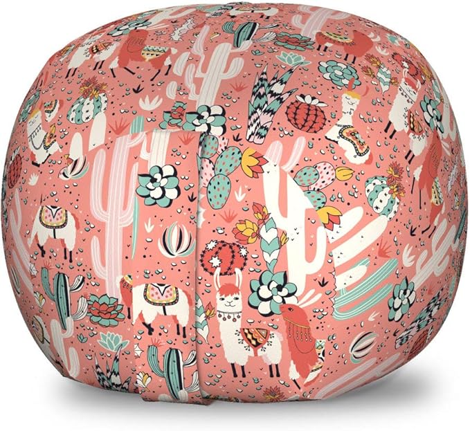 Lunarable Cactus Storage Toy Bag Chair, Cartoon Illustration of Arizona Mexico Desert with Succulent Plants and Llama Alpaca, Stuffed Animal Organizer Washable Bag, Small Size, Coral Pink
