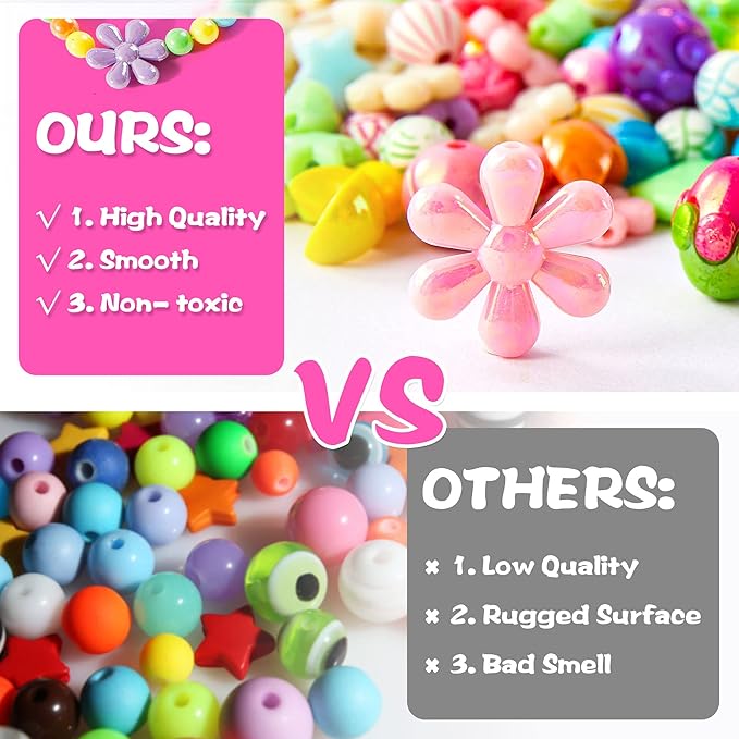 - Over 1100 Beads for Kids: Over 1100 Jewelry Making Beads in 15 different colors and shapes, include heart, pearls, bows, candy, flowers, stars, balls and all kinds of irregular shapes. The beads are made from acrylic plastic, environmentally non-toxic, fastness.