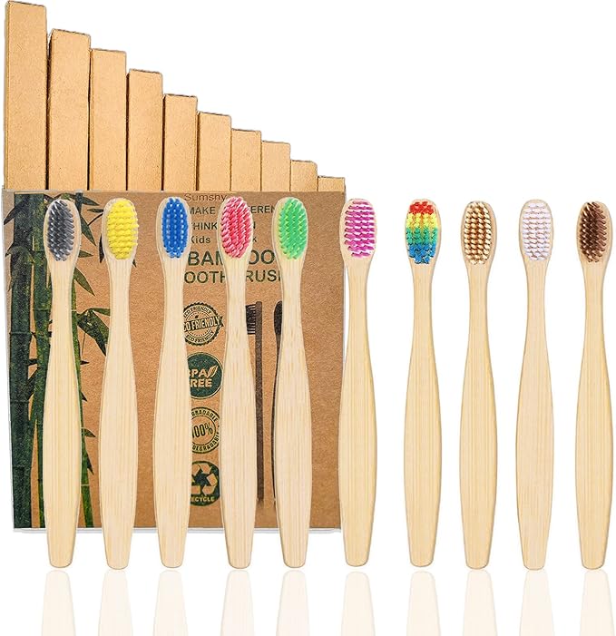10 Color Kids Bamboo Toothbrushes | BPA Free Soft Bristles Wooden Toothbrushes | Eco-Friendly Biodegradable & Compostable Charcoal Toothbrushes - Economy Family Pack