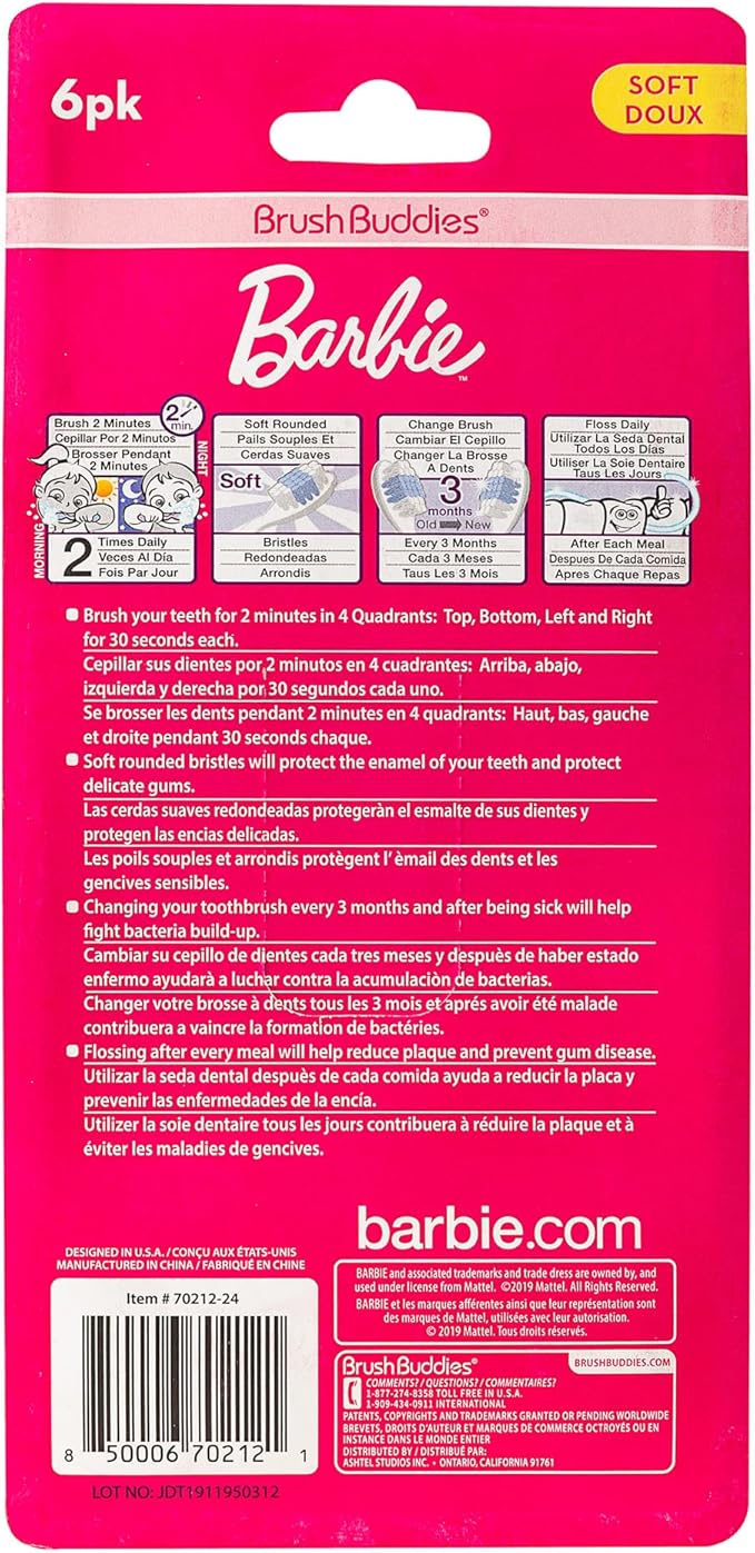 - [What's Included] The Brush Buddies Barbie Manual Toothbrush Pack includes 6 multi-colored Barbie kid's toothbrushes.