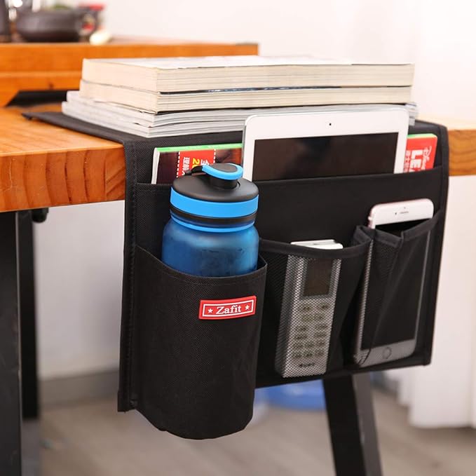 - Create extra storage that won't take up room on your bedside table; Perfect for storing magazines, books, cell phones, remotes, glasses, notebooks, and so on; The rounded pocket is perfect for holding water bottles.