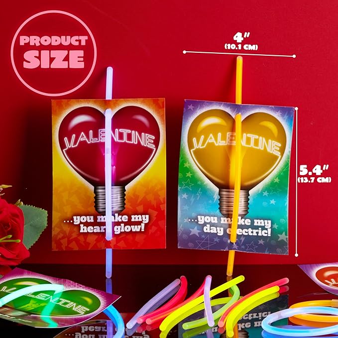 - FUNNY GIFT. If kids bend the glow stick into a circle, connect the ends with a connector, it will turn into a glowing bracelet. Valentine's Day Cards are Perfect for Kids, Valentine's Day, Class Events, Gift Exchange, School Classroom Prize, Love Notes and any Occasions.