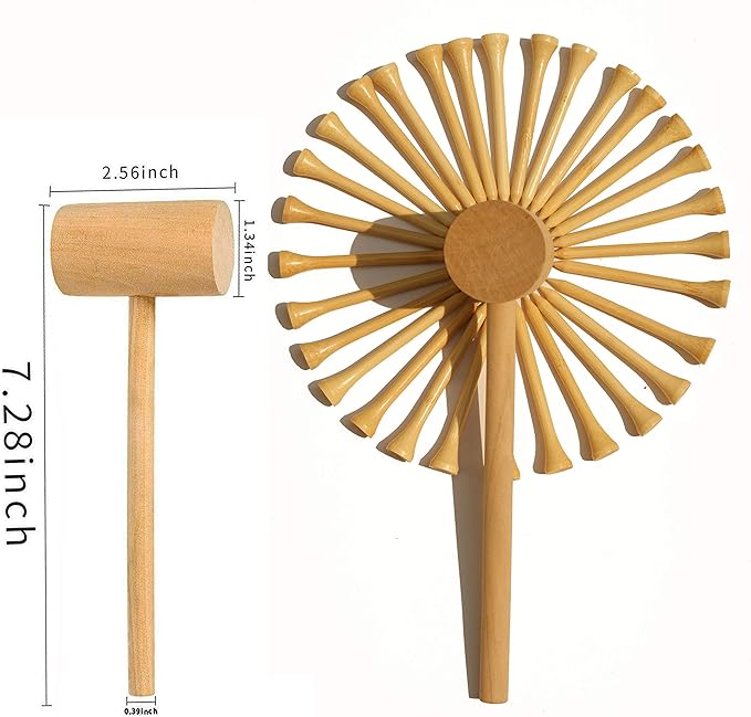 - * NATURE FRIENDLY TOY: This hammering toy is hand-made carefully, they are in natural color (no paint). The wood hammer is 7.5 inches in length. The bamboo nail measures 2.75 inches long and its head measures 0.4 inches in diameter. Each nail has larger head so your kids can put some unique things on it such as small ball, colorful beads, buttons…This will be a wonderful game to play and improve their creation.They also are sustainable and very smooth.