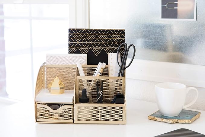 - π¦π§π¬ππ π πππ§π¦ ππ¨π‘ππ§ππ’π‘: This metal desktop organizer features a polished gold finish and perforated design that elevates any workspace while keeping everyday office items neatly sorted and within reach.