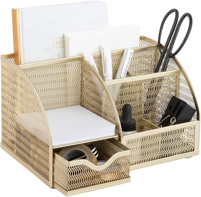 BLU MONACO | Gold Desk Organizer with Drawer | Metal Desktop Caddy with Six Compartments for Office Supplies | Stylish Desk Organizers and Accessories for Home or Office