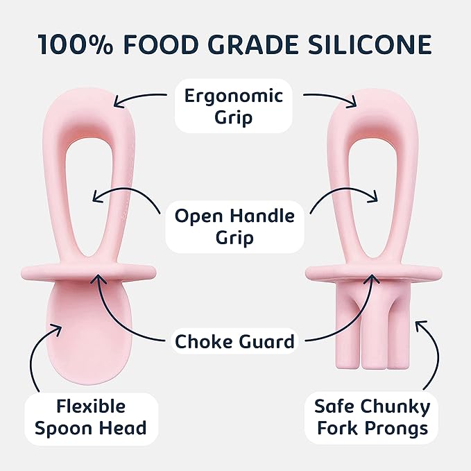 - TRAINING UTENSILS FOR BABY: Train your little one to be an independent self-feeder with a food grade silicone spoon and fork that feels soft and gentle on their gums. Our Tiny Twinkle silicone training utensils or baby-led weaning tools encourage your babies and toddlers in their first stage of self-feeding to learn how to eat in a fun, easy, and safe way.