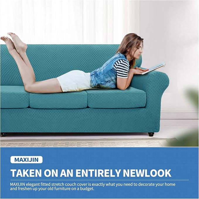 - 4 PIECES INCLUDED - MAXIJIN premium stretch sofa cover is exclusive designed for those couches with individual cushions, which includes one couch cover and three cushion covers, a Must-have magic sofa covers for 3 cushion couch! Because the seat cushions cover are separated, they will fit better, and not change the whole outlook of your couch, looks like a customized slip cover. And the strong elastic edge on bottom help secure the cover and ensure 100% NON-SLIP