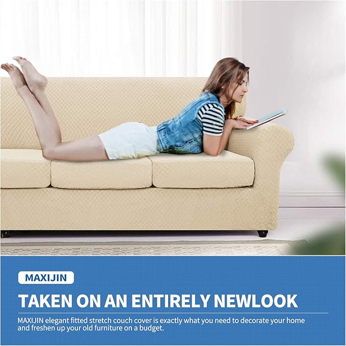 - 4 PIECES INCLUDED - MAXIJIN premium stretch sofa cover is exclusive designed for those couches with individual cushions, which includes one couch cover and three cushion covers, a Must-have magic sofa covers for 3 cushion couch! Because the seat cushions cover are separated, they will fit better, and not change the whole outlook of your couch, looks like a customized slip cover. And the strong elastic edge on bottom help secure the cover and ensure 100% NON-SLIP