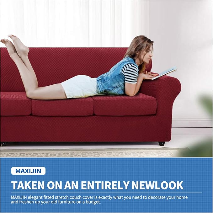 - 4 PIECES INCLUDED - MAXIJIN premium stretch sofa cover is exclusive designed for those couches with individual cushions, which includes one couch cover and three cushion covers, a Must-have magic sofa covers for 3 cushion couch! Because the seat cushions cover are separated, they will fit better, and not change the whole outlook of your couch, looks like a customized slip cover. And the strong elastic edge on bottom help secure the cover and ensure 100% NON-SLIP