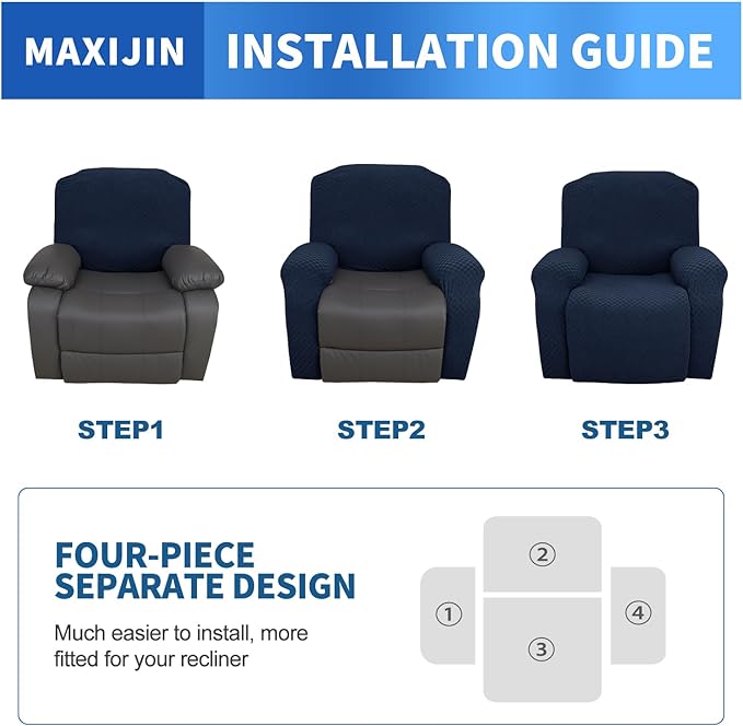 - 4 PIECES INCLUDED - MAXIJIN premium stretch recliner cover has exclusively 4 pieces designe, which includes one back cover, one seat cover and two arm covers. A Must-have magic recliner chair cover for recliner chair! Because the 4 pieces recliner slipcovers are separated, they will fit better, and not change the whole outlook of your recliner, looks like a customized slip cover. And the strong elastic edge on bottom help secure the recliner slip cover and ensure 100% NON-SLIP
