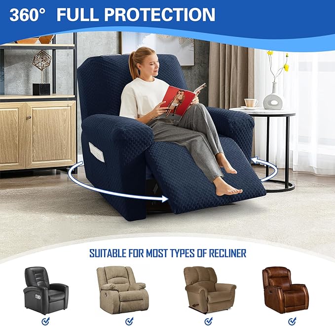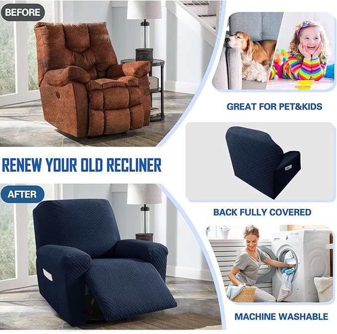MAXIJIN Recliner Cover Slipcovers for Living Room 4 Pieces Stretch Jacquard Recliner Chair Cover Soft Fitted Recliner Protector with Elastic Bottom for Kids, Pets (Recliner, Navy Blue)