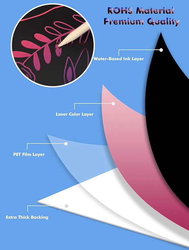 - 【Easy to Use & Endless Creativity】Simply use the included bamboo styluses to scratch away the black coating and reveal the beautiful rainbow backgrounds. This easy-to-use process requires no paint and is suitable for creators of all ages. Whether for kids’ crafts or adult doodles, this set provides endless fun and creative inspiration.