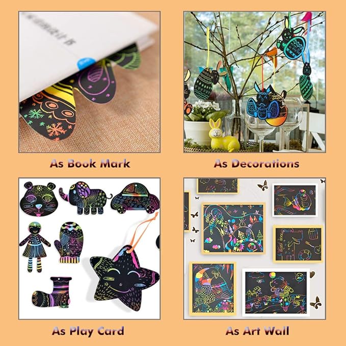 - 【Versatile Uses for Various Activities】This scratch paper is perfect for making handmade cards, greeting cards, classroom teaching tools, and home decorations. Finished artworks can be framed and displayed on walls or desks. It’s also great for family games and party activities, encouraging kids to interact and enjoy the creative process.