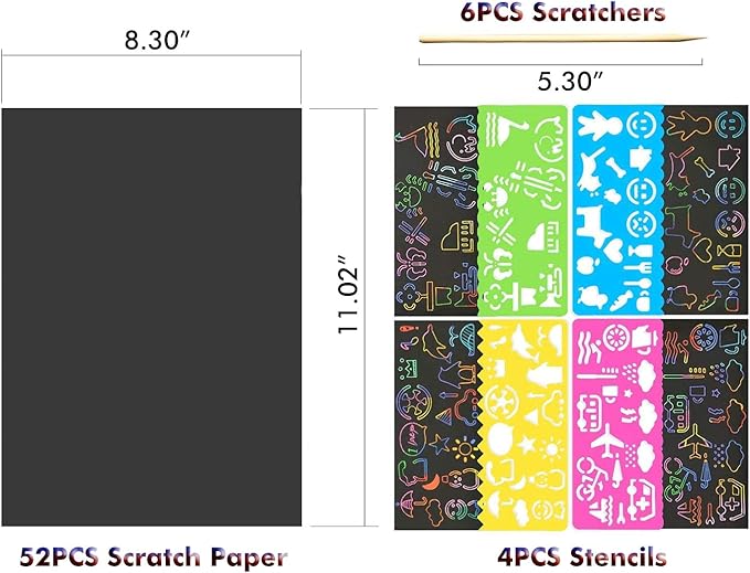 - 【52 Sheets Rainbow Scratch Paper Kit】This set includes 52 sheets of rainbow scratch paper, each measuring 8.3 x 11.02 inches, along with 6 bamboo styluses and 4 drawing stencils. These versatile tools provide endless creative opportunities for both kids and adults. The vibrant rainbow backgrounds inspire artistic expression and are ideal for various art projects.