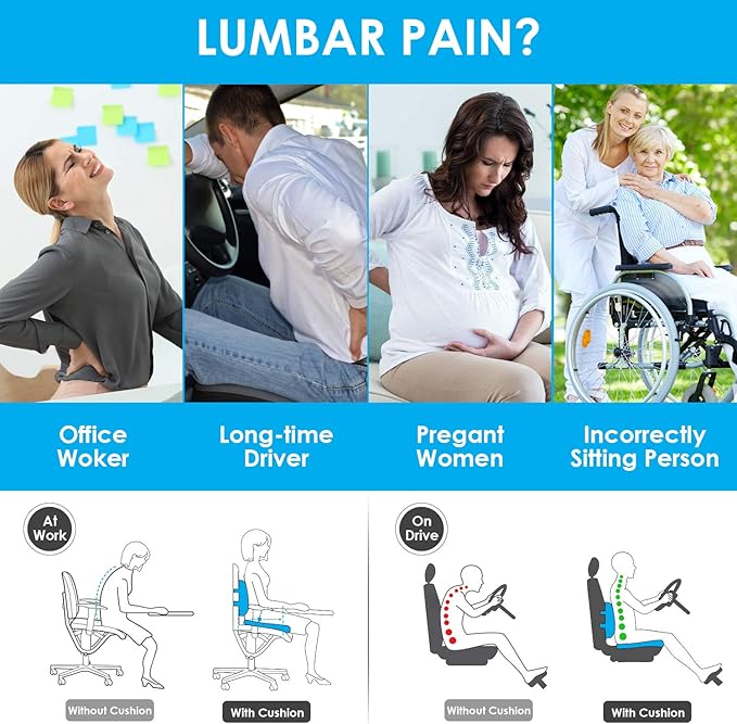 - ❤【Portable Seat Cushion for Tailbone Pain Relief 】The portable handle on the seat pillow allows you to easily switch between home and office.Used together or separately, the ergonomic seat cushion for hip and back pain can be adapted to various types of seats,suitable for drivers, teachers, students, people with wheelchair, pregnant women, office workers, etc.ADD the Car seat cushion and chair lumbar support pillow to your cart now !