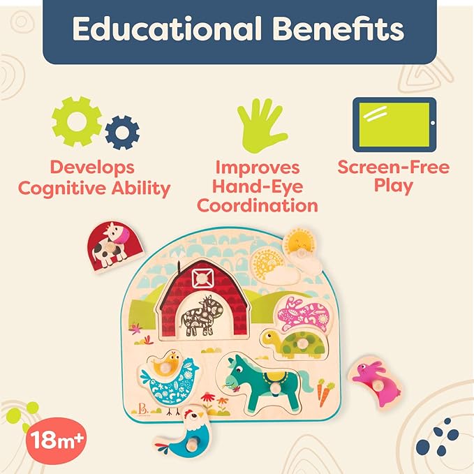 B. toys- Animal Barnyard- Wooden Peg Puzzle – Farm Puzzle – Animal Peg Puzzle for Toddlers, Kids – 8 Chunky Pieces – 18 Months +