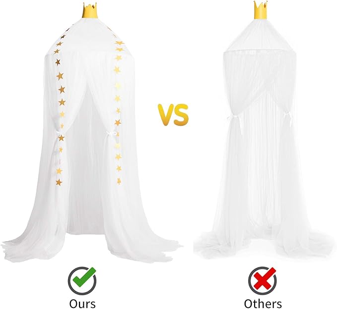 - FLUFFY 10 LAYERS HEM LACE DECOR CANOPY: The girls' dreamy canopy is made of high qualified 10 layers of yarn and wire. It's breathable, durable, soft, lightweight. Much fuller and more exquisite with high quality. Package with two style crowns, a bunch of dotted yellow stars, create a charming kid's room. NOT only for summer, suitable for the whole year