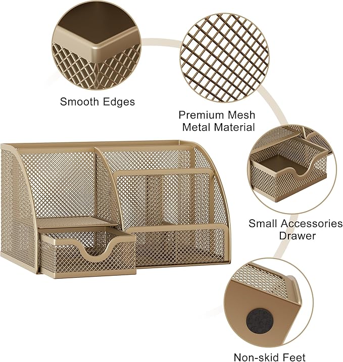 - Wire Mesh Desk Organizer: Crafted from premium mesh metal, this organizer withstands daily use in home offices, classrooms, or makeup vanities. Rust-resistant and easy to clean with a soft cloth.