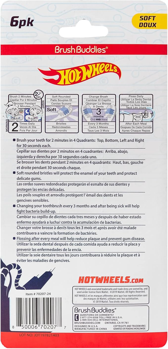 - [What's Included] The Brush Buddies Hot Wheels Manual Toothbrush Pack includes 6 multi-colored Hot Wheels kid's toothbrushes.