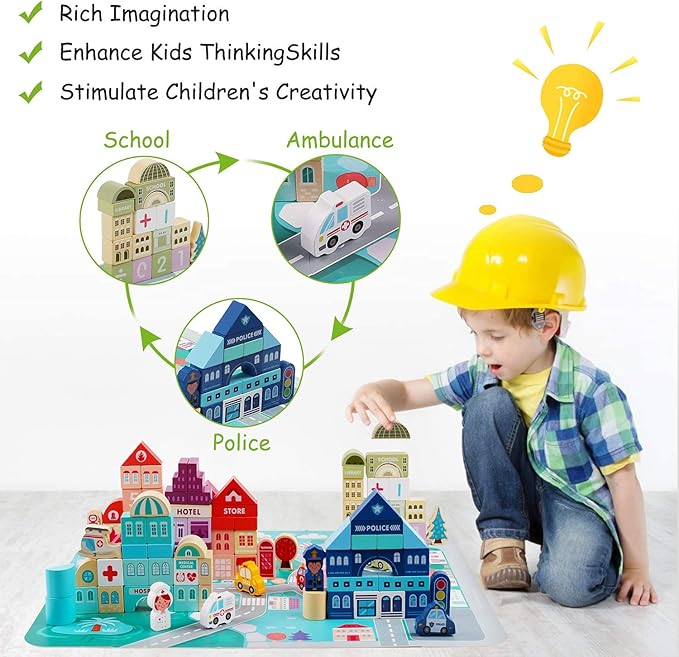 - 【Multiple Scene Combination】The building blocks include library, school, hospital, police office, hotel, cars and so on; And cute floor jigsaw puzzle also provides more playability and interest for the scene. This wooden toys can encourage children to understand the construction and transportation of various cities.
