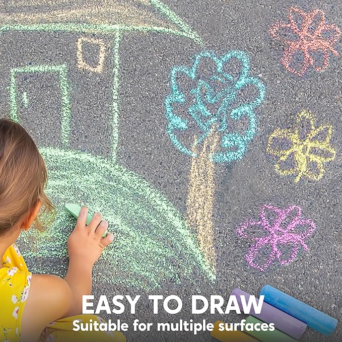 • SPECIAL DESIGN & EASY TO USE. Our Washable Chalks Set will allow your children to get outside and play, give them the opportunity to bring all kinds of artworks outside. Each chalk will give a vibrant color onto any driveway or sidewalk. The chalk can be washed on any surface, you don't have to worry about permanent messes.