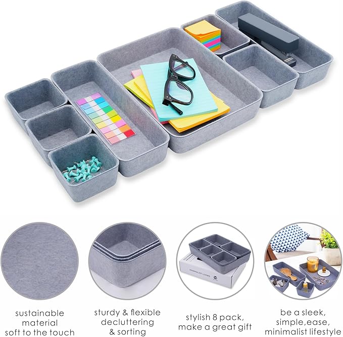 Welaxy Desk Drawer Organizer Tray, 8-Piece Felt Storage Drawer Dividers for Office & Home (Glacier gray)