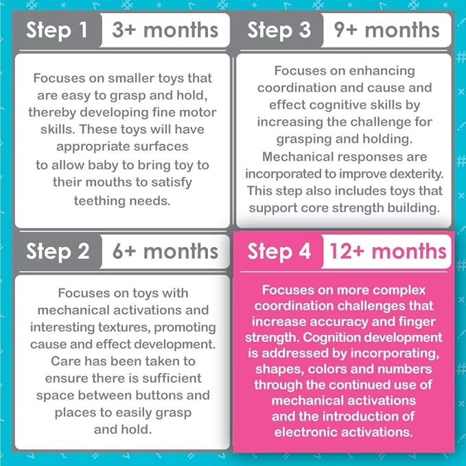 - 12 DIFFERENT MECHANICAL and ELECTRICAL ACTIVATION'S PROMPTS FOR PHYSICAL AND MENTAL DEVELOPMENT: Parents will love the 12 different activation's that help promote finger strength, cause and effect skills and cognitive development.