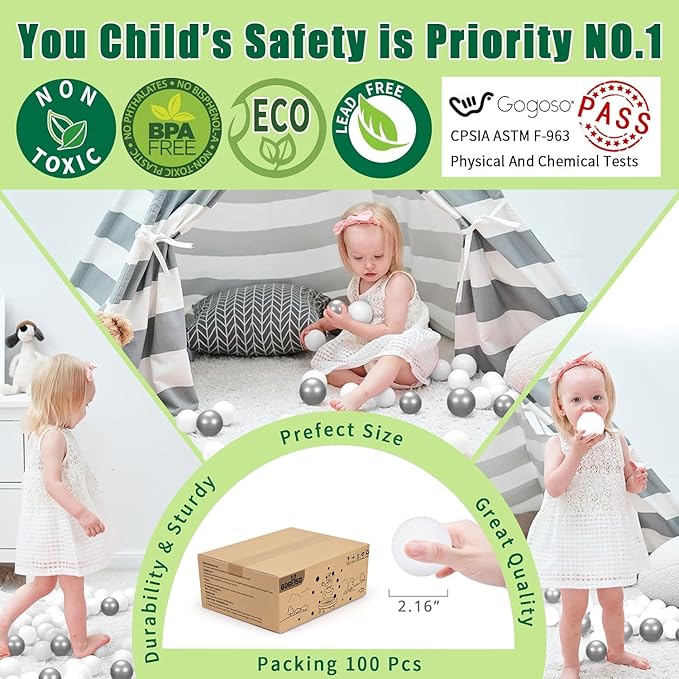 GOGOSO Ball Pit Balls - Plastic Play Pitballs Christmas Pelota Decoration, Grey, Light Grey, White for Baby Gifts Use for Kids Playpen Pool, 2.2 Inch, 100 pcs