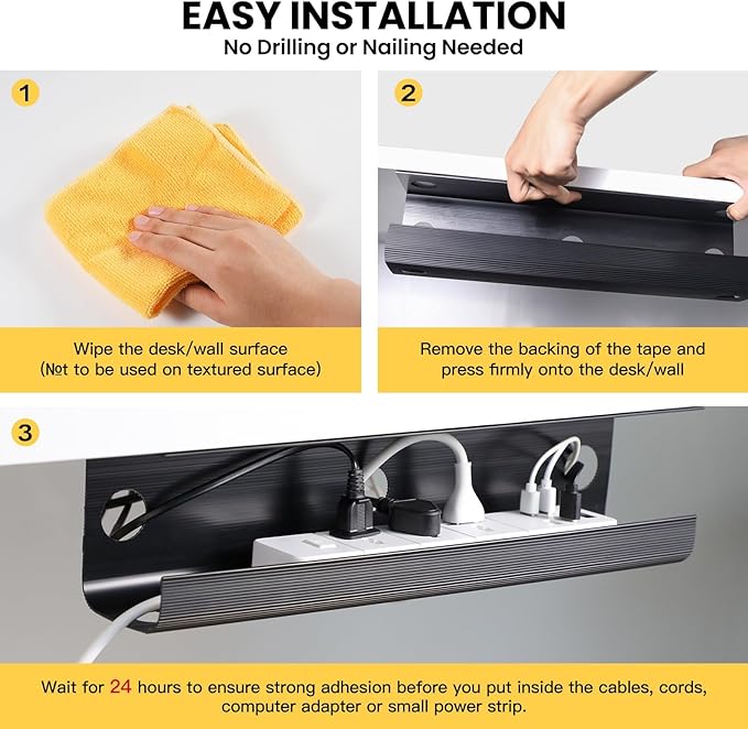 - Easy Installation with Strong Tape: No tools or screws needed.Installation is simply adhering the under desk cable management to the surface with adhesive tape.Wait for at least 24 hours before installing cables/power strips.The bearing capacity will be as high as 6lbs, it will be firmly fixed and not fall.To ensure your good experience, please do not use the wire organizer on textured walls