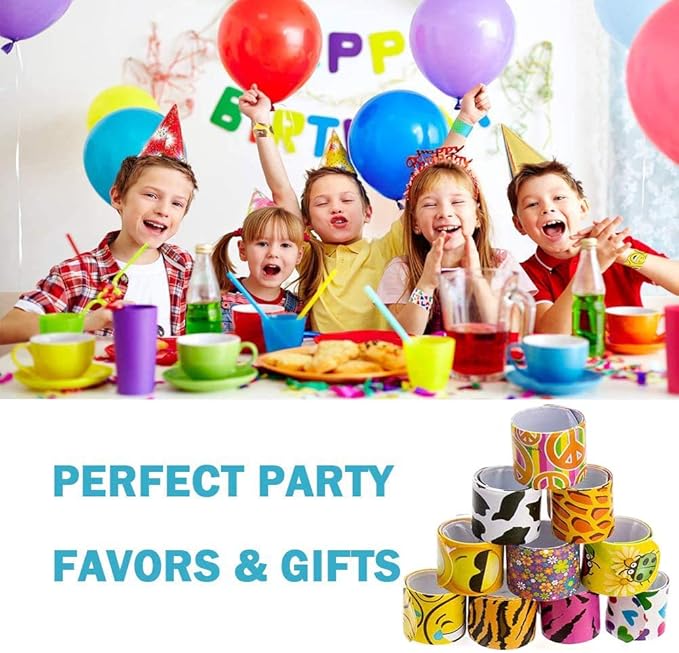 100 Pack Slap Bracelets | Slap Bands Birthday Party Supplies Favors with Hearts & Animal Print | One Size Fits All | For Kids, Boys, And Girls