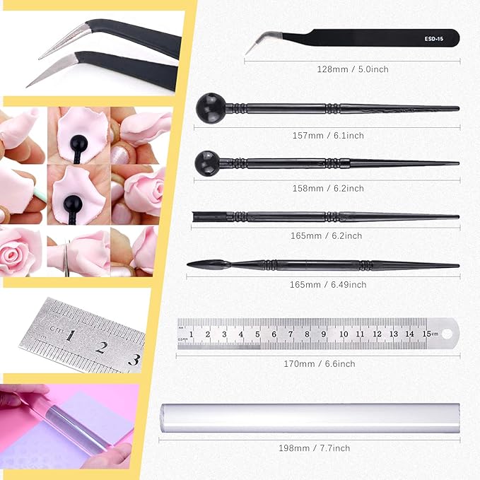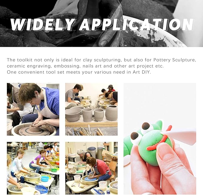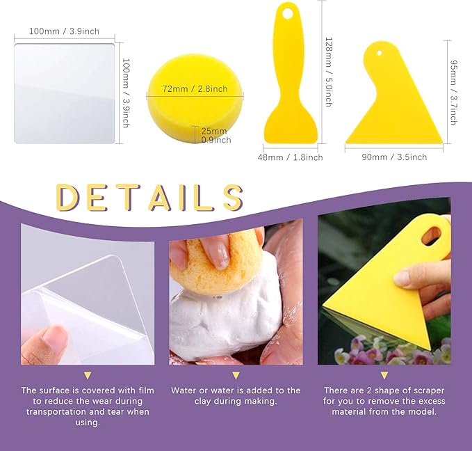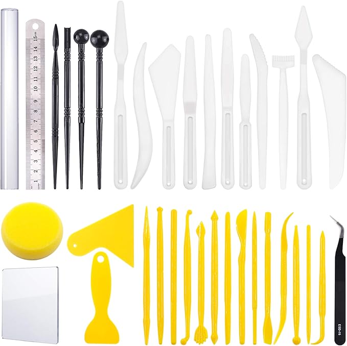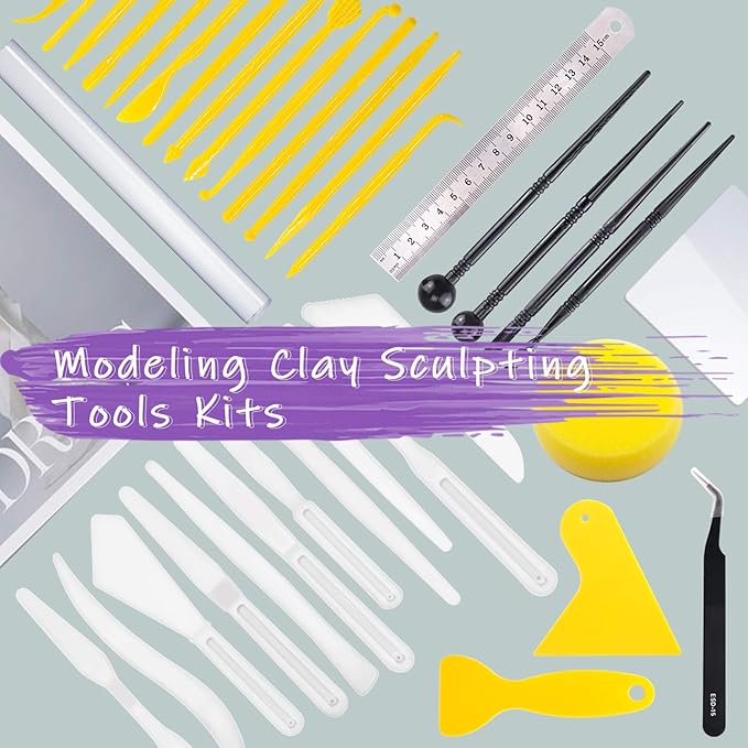- ❤ What You Get ----- In this kit, You will get 36Pcs Modeling Clay Sculpting Tools Kits, Including 1Pcs Clay Roller; 1Pcs Ruler; 2Pcs Clay Scarper; 1Pcs Sponge; 1Pcs Tweezers; 1Pcs Acrylic Backing board; 4Pcs Plastic Ball Rod Stylus Modeling Tools; 14Pcs Plastic Crafts Clay Modeling Tool; 11Pcs White Plastic Crafts Clay Modeling Tool ; 1Pcs 23*16cm Plastic File Bags for Cake Fondant Decoration and Nail Art Pottery Modeling Clay.