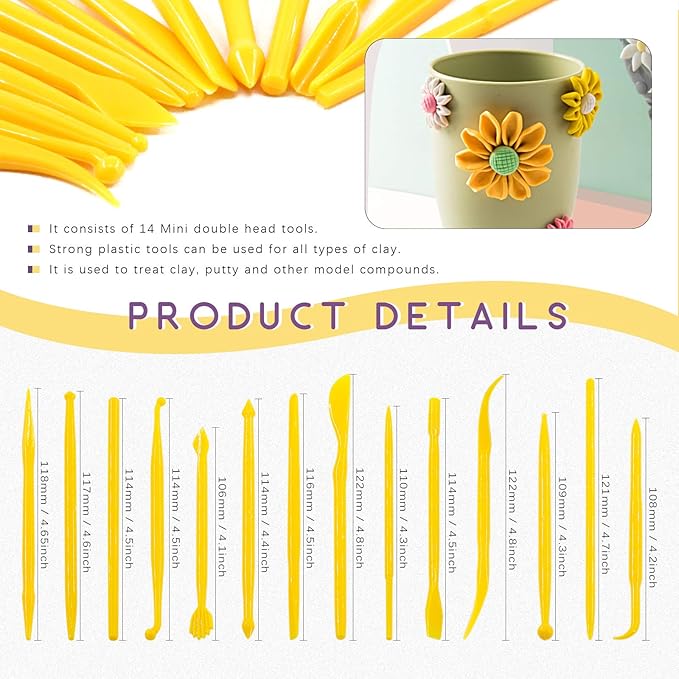 - ❤ 14Pcs Plastic Crafts Clay Modeling Tool ------ Clay tool set for working with clay, plasticine and other modeling compounds; Sturdy plastic tools can be used with all types of clays; Consists of 14 mini double ended tools; The curved end contours delicate feature ,Great for shaping and sculpting at school and home.