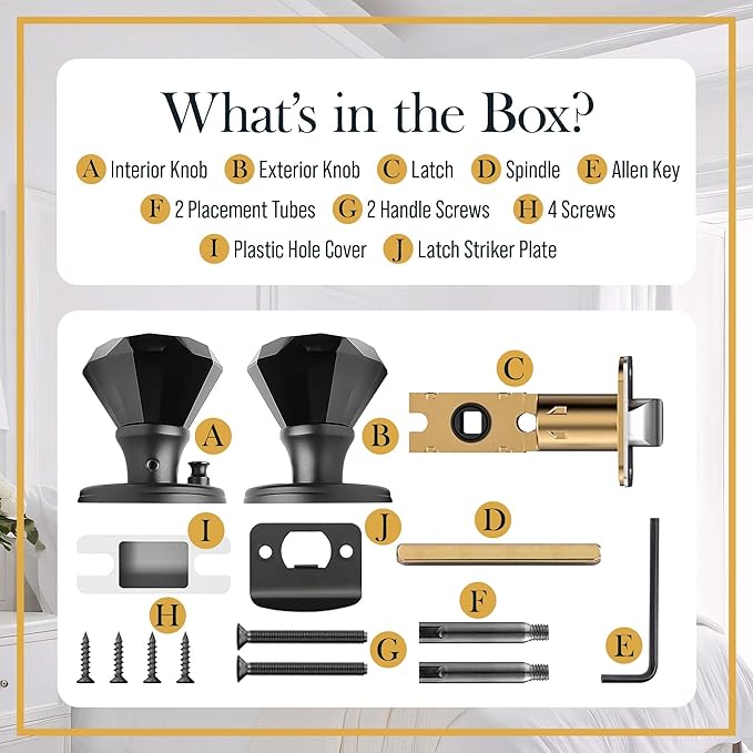 - ๐๐๐๐จ๐ซ๐ญ๐ฅ๐๐ฌ๐ฌ ๐๐ง๐ฌ๐ญ๐๐ฅ๐ฅ๐๐ญ๐ข๐จ๐ง โ Quickly assemble the black crystal door knob set with everything included: interior & exterior knob, spindle, latch, striker plate, screws, Allen key, placement tubes, privacy plunger, and instructions. Whether you're installing cool door knobs, vintage style door knobs, black glass knobs, or crystal door pullsโsetup is simple and stress-free.