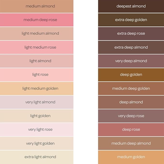 - COLORS OF THE WORLD: Includes colors such as Deepest Almond, Medium Golden, and Light Rose.