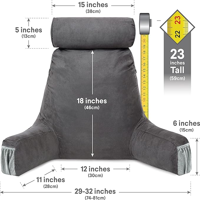 - Bed Rest Pillow with Arms: Remote, tablet, glasses, phone - Spacious side and back pockets mean there is space for all your most essential items. There’s even room to stash your favorite energy bar. Although with this relaxing bed rest pillow in your life you may be tempted to skip that evening run. Bikers and other exercise enthusiasts will love the detachable neck roll which makes a great bolster for tired knees or feet.