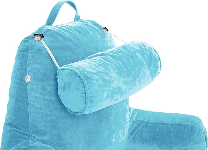 Husband Pillow Medium Carolina Blue, Backrest for Kids, Teens, Petite Adults - Reading Pillows with Arms, Adjustable Plush Memory Foam, Bed Rest Chair Sitting Up, Detach Neck Roll, Removable Cover