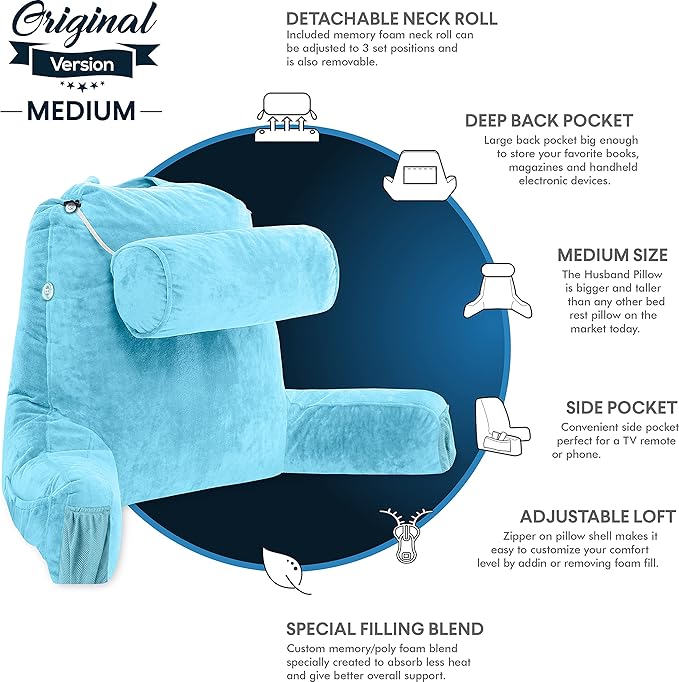 - So many features: the petite husband pillow comes with all the amenities of its big brother. The zipper on the inner shell allows you to add or remove foam for individualized comfort. Or you can shift the filling to create support just where you want it. Need a little extra “stuffing.” we’re happy to oblige by providing additional foam. Plus, side and back pockets are great for keeping your important gadgets handy, your phone, remote or tablet will always be right where you need them.