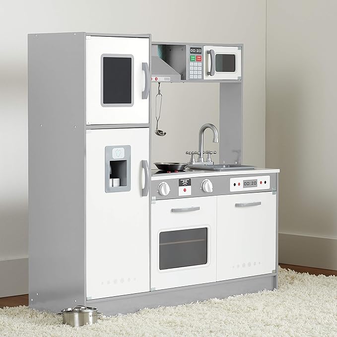 Amazon Basics Kids Upright Wooden Kitchen Toy Playset with Stove, Oven, Sink, Fridge and Accessories, for Toddlers, Preschoolers, Children Age 3+ Years, White & Gray, 39"L x 11.8"W x 39'H'