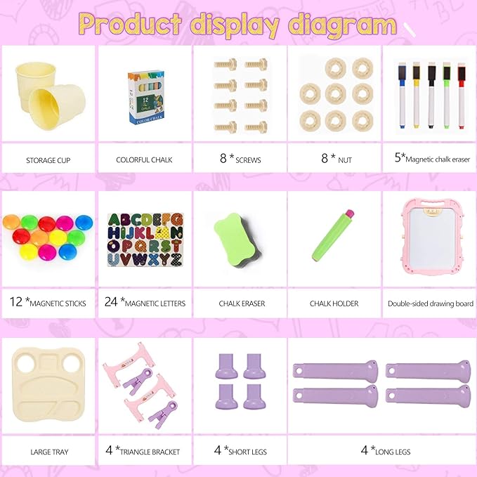 - 🔮Easy To Assemble And Adjust: The detailed installation instructions are located at the bottom of the carton, with plastic screws and nuts, which are beneficial to enhance the child's hands-on ability and intelligence, which is easy and fun for children. You can also adjust to the height you need by replacing the two types of easel feet to meet the different needs of children aged 3 years old. There is no doubt that even if your child grows up, he can always use it.