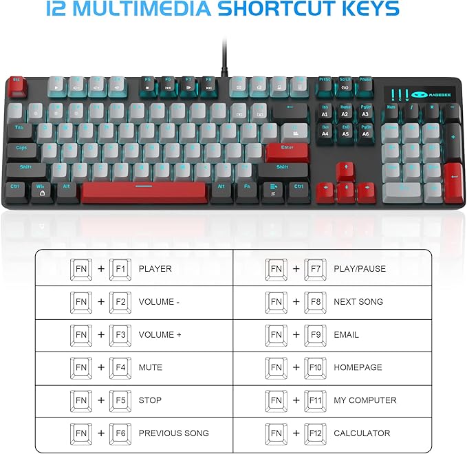 - HIGHLY RESPONSIVE & ANTI GHOSTING KEYBOARD: All keys have individual switches with full n-key rollover, which provides faster response and better keystroke feeling. 104 mechanical keys are conflict free, allowing you to press or hold multiple keys simultaneously. 12 multimedia combination keys on the top of the keyboard (FN+ F1~F12) offer quick operations, great for gaming and office.