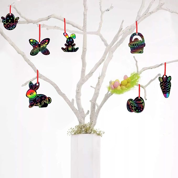 - EASY TO USE. Our Easter scratch papers are made of scratch paper, safe and durable material; Just choose your favorite shape, and then hold the wooden stick to scratch out patterns gently, and use the ribbon to hang.
