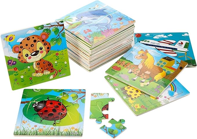 Yopay 24 Pack Wooden Puzzles for Kids,Mini Jigsaw Animal Puzzles Set for Kids Boys Girls, Early Preschool Educational Toys, 20 Animal Patterns + 4 Transportations