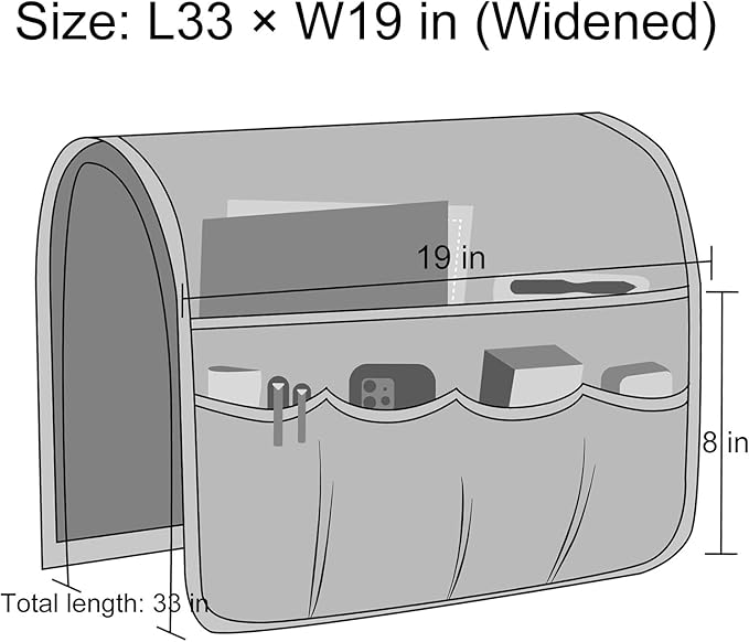 - Size and Pockets: Available in 2 widths (13ins and 19ins), the length is all 33 ins. The 13ins have 5 pockets (One big pocket and 4 small pockets ), The 19 ins have 6 pockets (2 big pockets and 4 samll pockets). You can put magazines, iPad, remote controls, eye-glasses, mobile phones into the pockets.