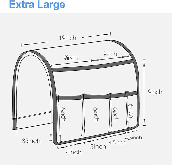 - Lager Size & 6 Pockets: Extra large armrest holder for sofa (35 x 19 inches) to cover the entire armrest avoid wear or breakage of the new chair arms, fits most couches, reclining chair, or as a bedside caddy. Has 6 pockets, never lost TV remote control, 6 pockets is the storage solution! Keeps your electronic accessories organized