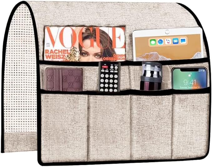 - Save Space Keep Clean: Armrest organizer storage 6 pockets for sofa recliner couch armchair tablet fit magazines, books, iPad, glasses, mobile phones, TV remote controls, bottles, make them always in reach with this armchair caddy. Function various places like living room, bedroom, office and coffee tea table