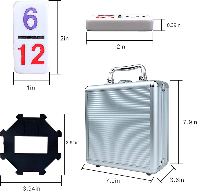 - 【CLASSIC TABLE GAME SET】91 Colored Number Dominoes Tiles +1 Aluminum Case +1 Instruction Manual + 9 Colorful Small Train+1 Plastic Starting Piece. Domino Tiles Dimensions :ABOUT 2*1*3/4 inches Aluminum Case Size:ABOUT 9.8*8.8*4inches Weight:5.07lb