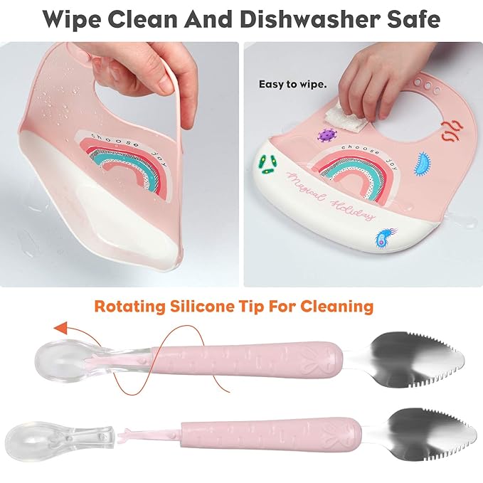 - 【Baby Food Feeder Set】Includes baby food spoon and bib. Travel Case is convenient to carry the baby spoon going out , ensures that no matter wherever, your baby utensils will stay incredibly clean. Baby silicone bib rolls up neatly for storage and travel, temperature resistance up to 180℃, can be in boiled water or steam.