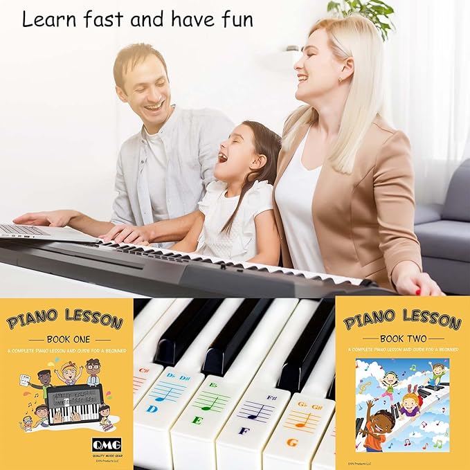 QMG Color Piano and Keyboard Stickers and Complete Color Note Piano Music Lesson and Guide Book 1 and Book 2 for Kids and Beginners; Designed and Printed in USA